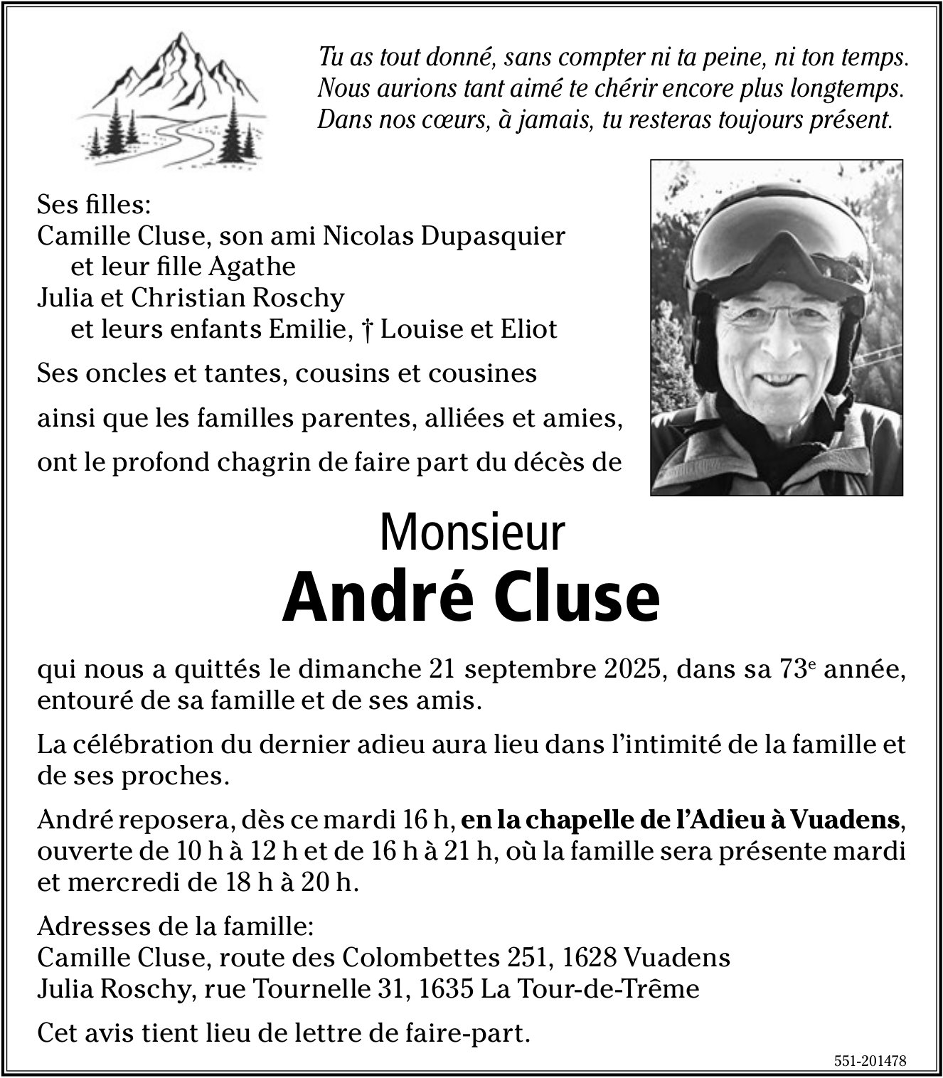 Avis de décès de Monsieur André Cluse paru le 23/09/2025, décédé à l'âge de 73 ans.