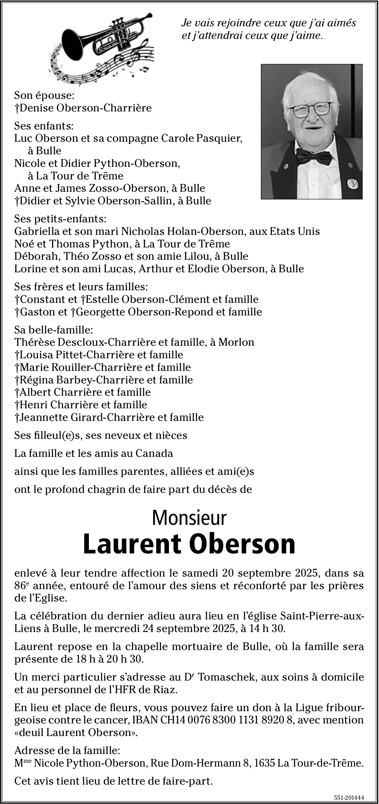 Avis de décès de Monsieur Laurent Oberson paru le 23/09/2025, décédé à l'âge de 86 ans.